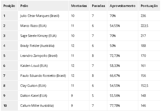 Na classificação geral, além de Júlio César Marques e Zampolo, o Brasil conta apenas com mais um representante entre os dez melhores: Paulo Eduardo Rosseto. Já os campeões mundiais Kaique Pacheco (19º), Cássio Dias (27º) e o tricampeão José Vitor Leme ainda não conseguiram vitórias nem montarias acima de 90 pontos nesta temporada.