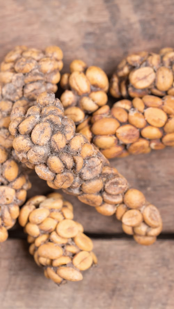 Um pé da planta de café normalmente leva cerca de 3 a 5 anos após o plantio para produzir seus primeiros frutos — as “cerejas de café”.