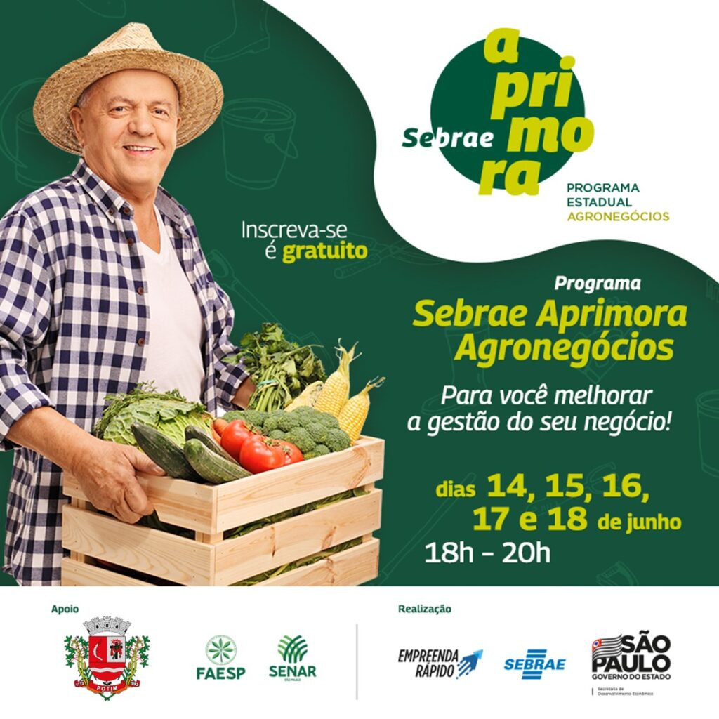 A Prefeitura divulgou no dia 21 de fevereiro de 2026 a abertura das inscrições para o Programa Sebrae Aprimora Agro que será realizado nos dias 14, 15, 16, 17 e 18 de junho, voltado a empreendedores do setor rural.